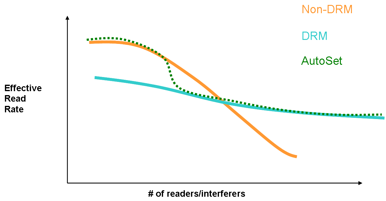 In addition to the reader modes shown in the chart above, the Impinj reader offers mode setting whereby the reader adjusts automatically and dynamically according to the environment and measured throughput. This mode is designated AutoSet (LLRP mode index '1000').